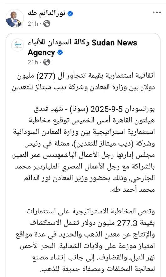 ▪️وزير المعادن #نورالدائم_طه قام بالاحتفال بتوقيع العقد الذي وقعه مع شركة #ديب_ميتالز بمشاركة الخبر في صفحته، واليوم قام بنفي الخبر. 😂😂