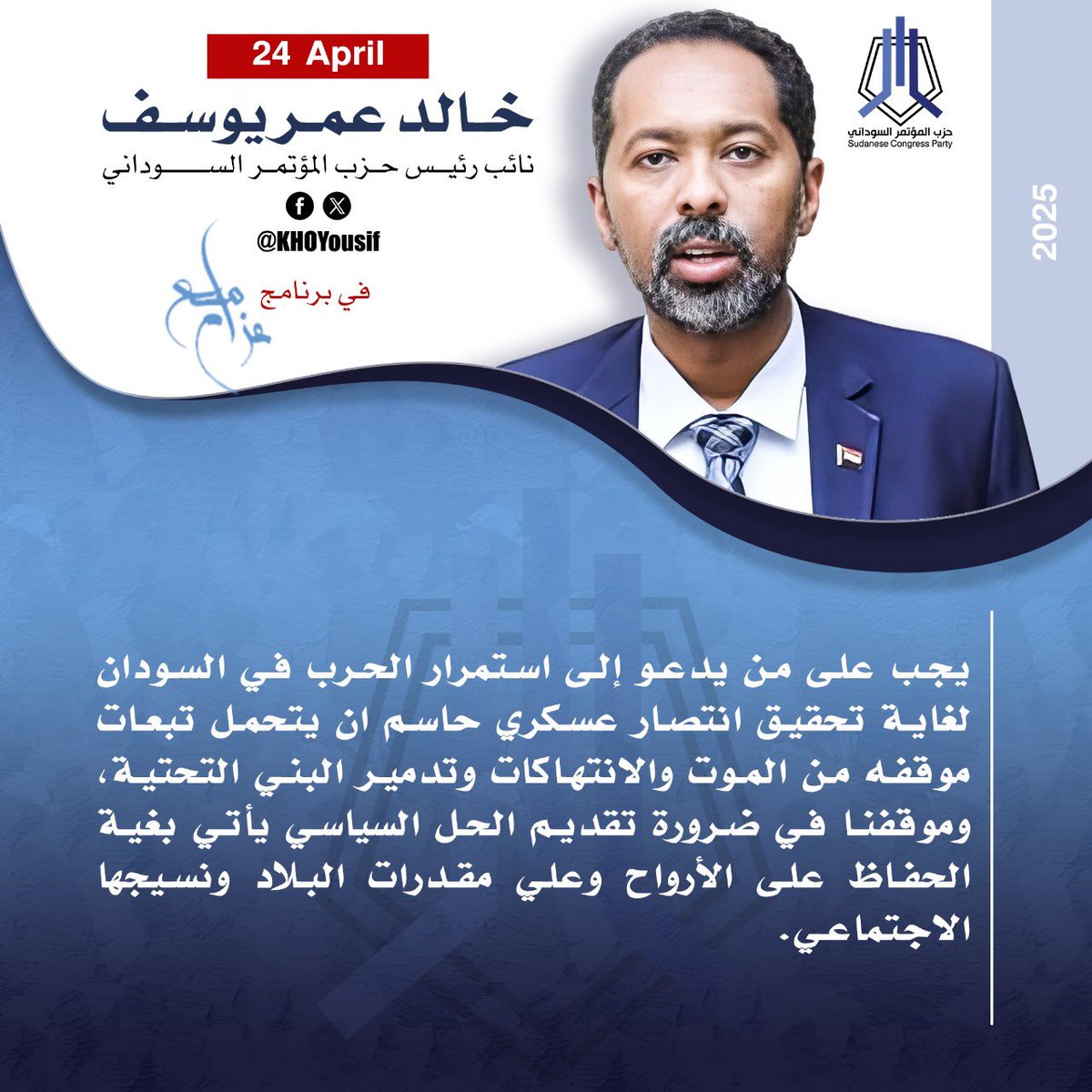 يجب على من يدعو إلى استمرار الحرب في السودان لغاية تحقيق انتصار عسكري حاسم ان يتحمل تبعات موقفه من الموت والانتهاكات وتدمير البني التحتية، وموقفنا في ضرورة تقديم الحل السياسي يأتي بغية الحفاظ على الأرواح وعلي مقدرات البلاد ونسيجها الاجتماعي.