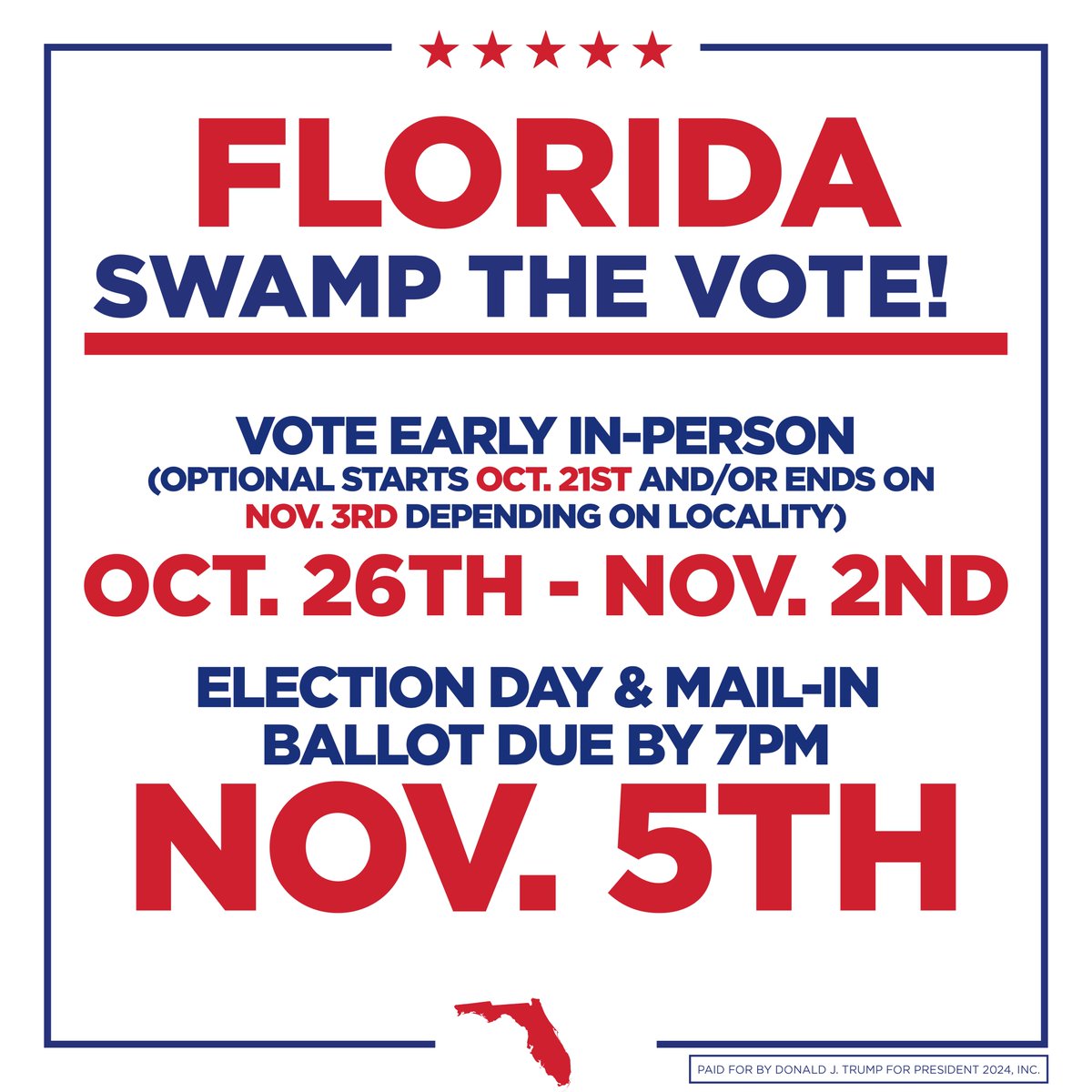FLORIDA! In-person early voting ends tomorrow—Make a plan to VOTE. Together, we will MAKE AMERICA GREAT AGAIN! https://t.co/inz0ACGd5v https://t.co/0X5FEtkYen