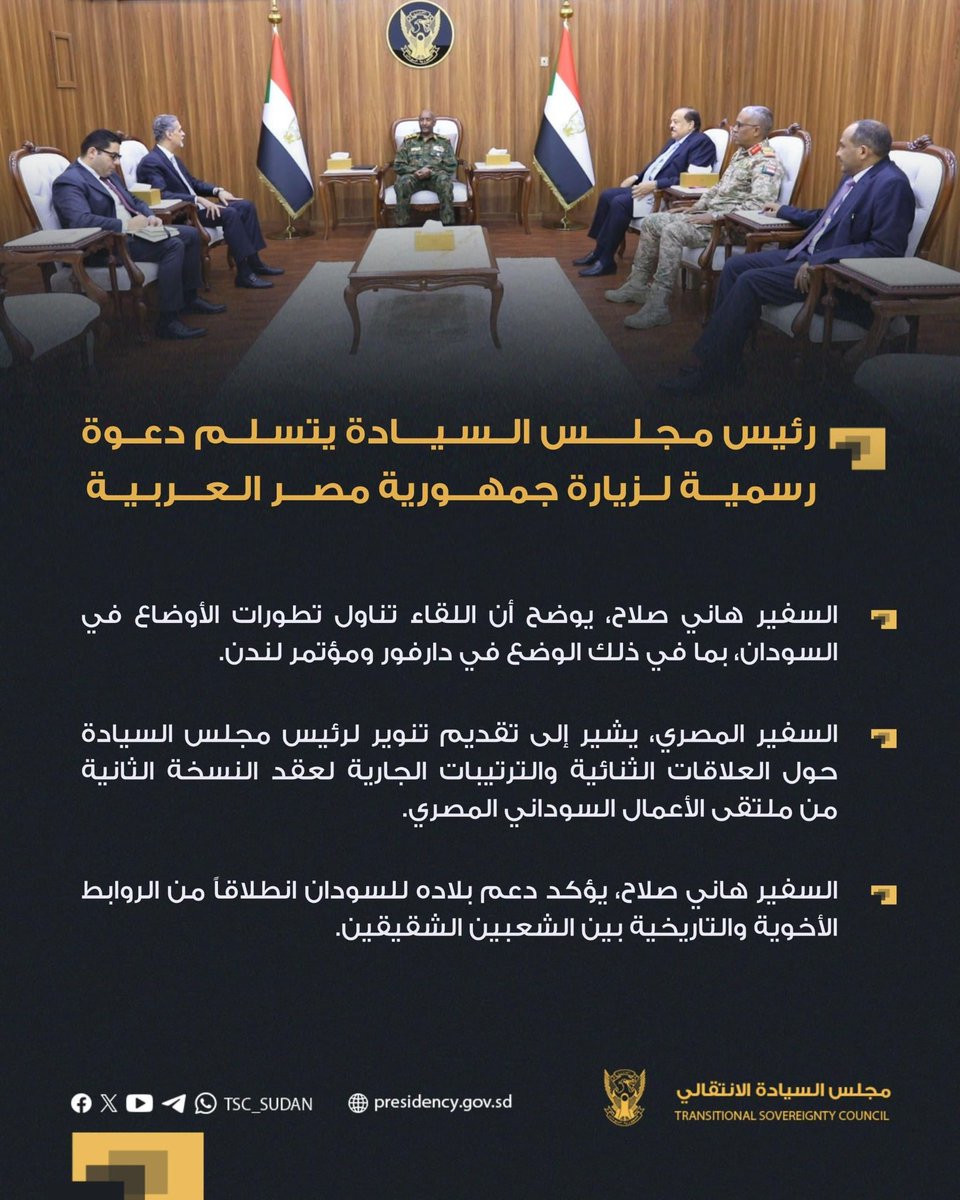 مجلس السيادة رئيس مجلس السيادة يتسلم دعوة رسمية لزيارة جمهورية مصر العربية بورتسودان ١٦-٤-٢… By null Published September 7, 2025 Share SHARE Facebook Twitter Pinterest LinkedIn[ad_1] ⭕️ رئيس مجلس السيادة يتسلم دعوة رسمية لزيارة جمهورية مصر العربية بورتسودان ١٦-٤-٢٠٢٥م [ad_2] Source by مجلس السيادة الإنتقالي – السودان Facebook Twitter Pinterest LinkedIn Share This Article Facebook Twitter Email Print Previous Article The delegation pointed to the weakness of the performance of the civil administr… Next Article أبوها خليل مجرم حرب، وعمها جبريل مجرم حرب… طوال الـ 23 عامًا الماضية، كان عمها ي… Leave a Comment Leave a Reply Cancel replyYour email address will not be published. Required fields are marked *Comment * Name * Email * Website Save my name, email, and website in this browser for the next time I comment. Δ SearchSearchRecent Postsأكرمنا الله صباح اليوم الأحد بلقاء إخوةٍ كرام، على ضفة النيل الأزرق، حيث شاي الش… أعلن بنك السودان المركزي في منشور إدارة السياسات رقم (2025/15) رفع الاحتكار عن ا… ندوة بعنوان: القانون الدولي والسيادة الوطنية قراءة في موقف السودان من لجنة تقصي … والي نهر النيل تستقبل وزير الموارد البشرية والرعاية الاجتماعية الوزير يشيد بالأ… كامل ادريس: رئيس اللجنة السياسية لمؤسسات الدولة السودانية. Recent CommentsNo comments to show.