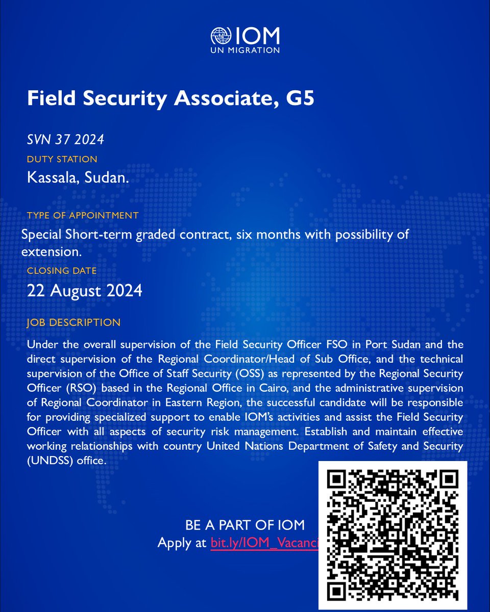 IOM is looking for a Field Security Associate G5, Kassala, Sudan.