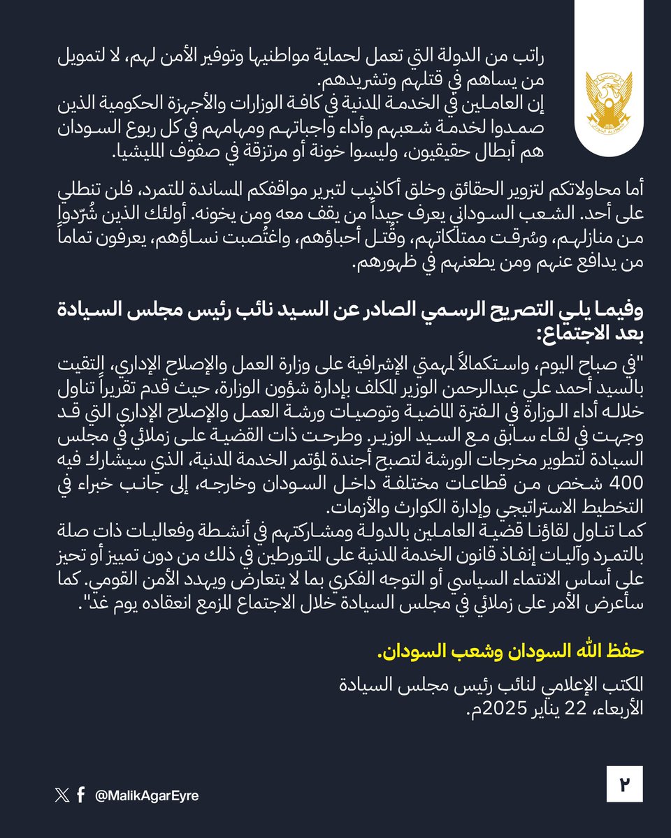 مالك عقار توضيح صحفي من مكتب نائب رئيس مجلس السيادة … By null Published September 8, 2025 Share SHARE Facebook Twitter Pinterest LinkedIn[ad_1] توضيح صحفي من مكتب نائب رئيس مجلس السيادة [ad_2] Source by Malik Agar Eyre | مالك عقار اير Facebook Twitter Pinterest LinkedIn Share This Article Facebook Twitter Email Print Previous Article عضو مجلس السيادة عبدالله يحى يلتقي رئيس المحكمة الدستورية دكتور وهبي محمد مختار … Next Article الـسـودان بين الــحـرب والفراغ الدستوري | تغطية خاصة لتمرد حميدتي لليوم 871 ضيو… Leave a Comment Leave a Reply Cancel replyYour email address will not be published. Required fields are marked *Comment * Name * Email * Website Save my name, email, and website in this browser for the next time I comment. Δ SearchSearchRecent Postsأكرمنا الله صباح اليوم الأحد بلقاء إخوةٍ كرام، على ضفة النيل الأزرق، حيث شاي الش… أعلن بنك السودان المركزي في منشور إدارة السياسات رقم (2025/15) رفع الاحتكار عن ا… ندوة بعنوان: القانون الدولي والسيادة الوطنية قراءة في موقف السودان من لجنة تقصي … والي نهر النيل تستقبل وزير الموارد البشرية والرعاية الاجتماعية الوزير يشيد بالأ… كامل ادريس: رئيس اللجنة السياسية لمؤسسات الدولة السودانية. Recent CommentsNo comments to show.