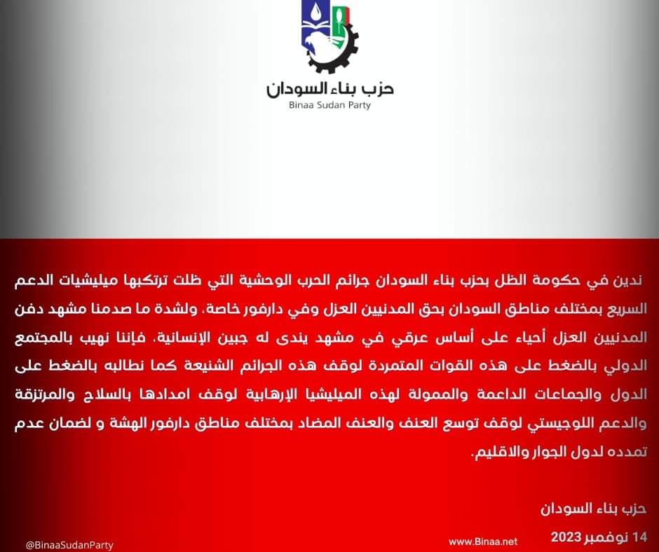 ندين في حكومة الظل بحزب بناء السودان جرائم الحرب الوحشية التي ظلت ترتكبها ميليشيات الدعم السريع بمختلف مناطق السودان بحق المدنيين العزل وفي دارفور خاصة، ولشدة ما صدمنا مشهد دفن المدنيين العزل أحياء على أساس عرقي في مشهد يندى له جبين الإنسانية، فإننا نهيب بالمجتمع الدولي بالضغط على هذه القوات المتمردة لوقف هذه الجرائم الشنيعة كما نطالبه بالضغط على الدول والجماعات الداعمة والممولة لهذه الميليشيا الإرهابية لوقف امدادها بالسلاح والمرتزقة والدعم اللوجيستي لوقف توسع العنف والعنف المضاد بمختلف مناطق دارفور الهشة و لضمان عدم تمدده لدول الجوار والاقليم.