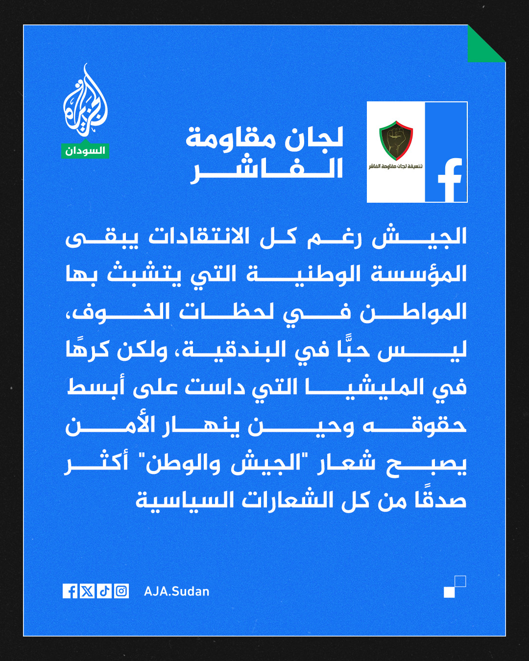 تنسيقية لجان مقاومة الفاشر: حين ينهار الأمن يصبح شعار “الجيش والوطن” أكثر صدقًا من كل الشعارات السياسية التي لم تحمِ الناس من القتل ولا من الجوع ولا من التهجير