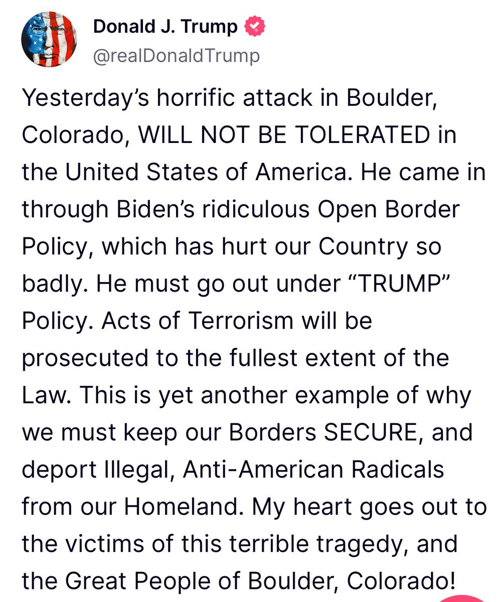 🚨 #ترمب يقول ان منفذ هجوم كولورادو أتى إلى اميركا من خلال سياسة “الحدود المفتوحة” ل #بايدن واضاف: “هذا مثال آخر على ضرورة إبقاء حدودنا آمنة وترحيل المتطرفين غير الشرعيين والمعادين لأمريكا من وطننا.”