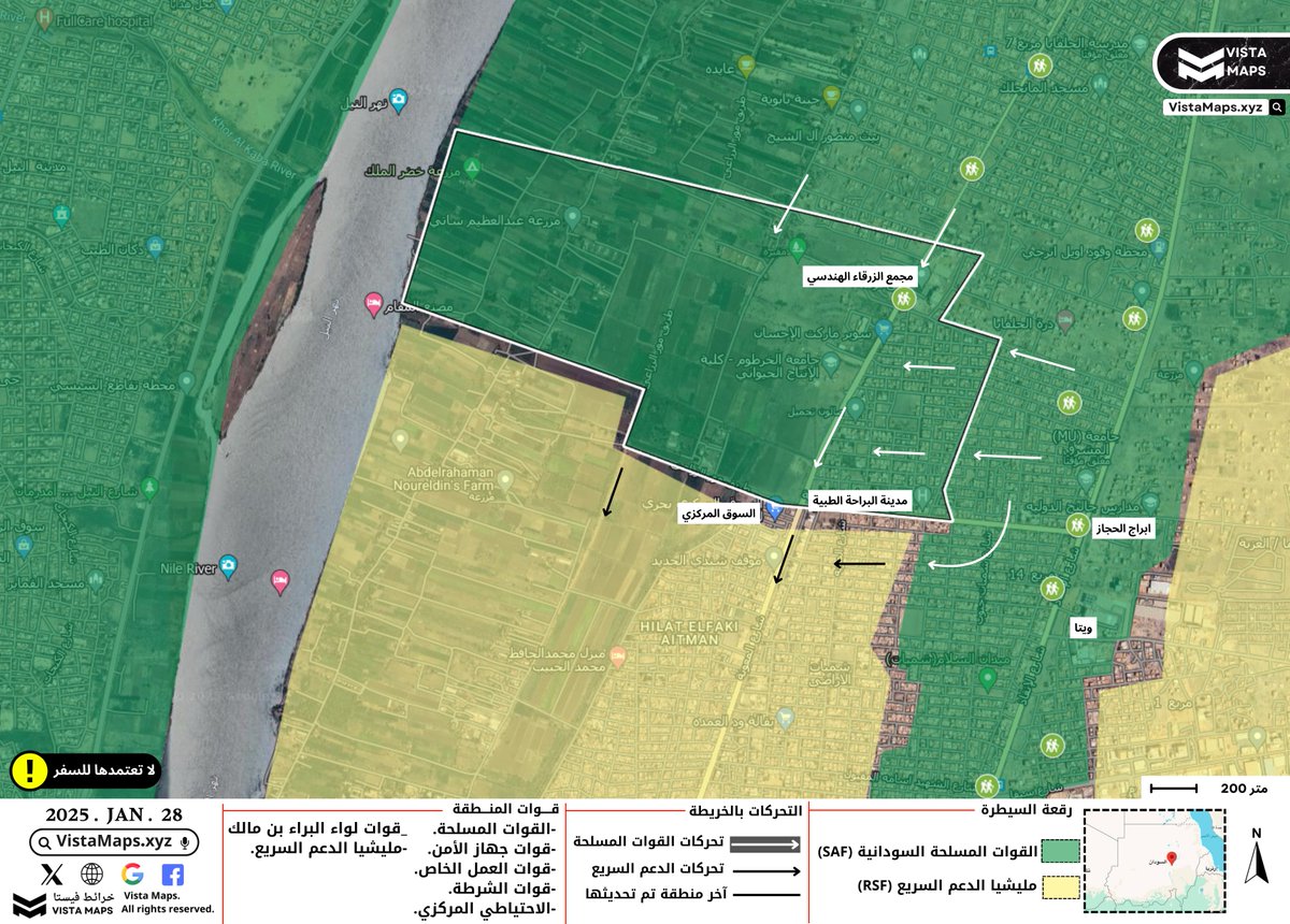 – مليشيا الدعم السريع تنسحب جنوباً بينما تواصل القوات المسلحة ملاحقتها والتقدم نحو السوق المركزي.