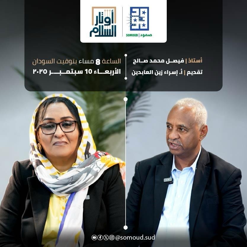 حلقة جديدة من برنامج أوتار السلام نستضيف فيها الأستاذ فيصل محمد صالح، الصحفي والكاتب والمحلل السياسي، في حوار تقدمه الإعلامية إسراء زين العابدين، حول تطورات الحرب في السودان، ودور الإعلام الديمقراطي، ومستقبل الإسلاميين، وغيرها من الأسئلة، وذلك يوم غدٍ الأربعاء 10 سبتمبر 2025 – الساعة الثامنة مساءً بتوقيت السودان.