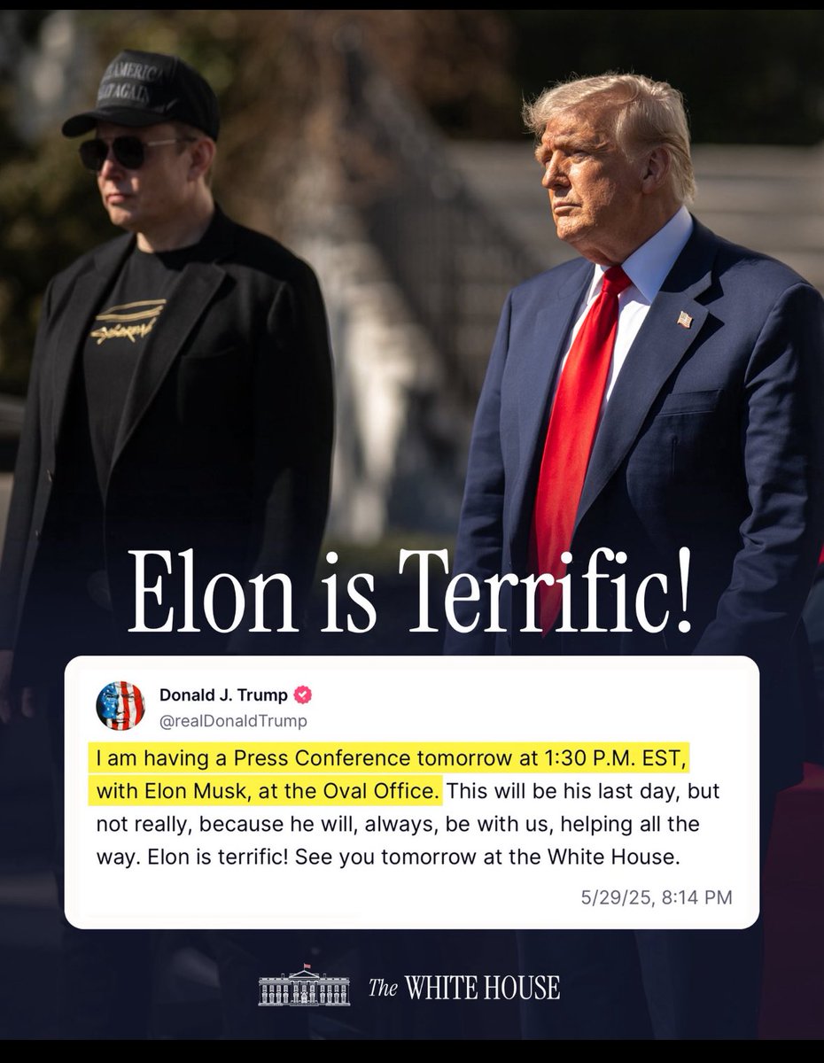 اليوم يعقد #ترامب مؤتمراً صحافيا” مع إيلون ماسك لاختتام مهامه في ادارته.