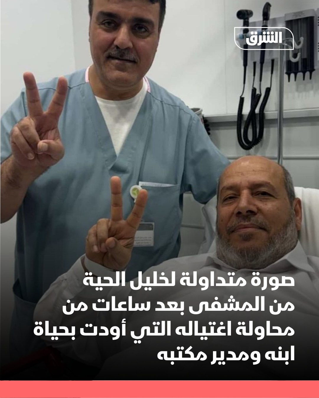 صورة متداولة للقيادي في حماس خليل الحية من المشفى بعد ساعات من محاولة اغتياله، التي أودت بحياة ابنه ومدير مكتبه و 3 أعضاء آخرين في الحركة.