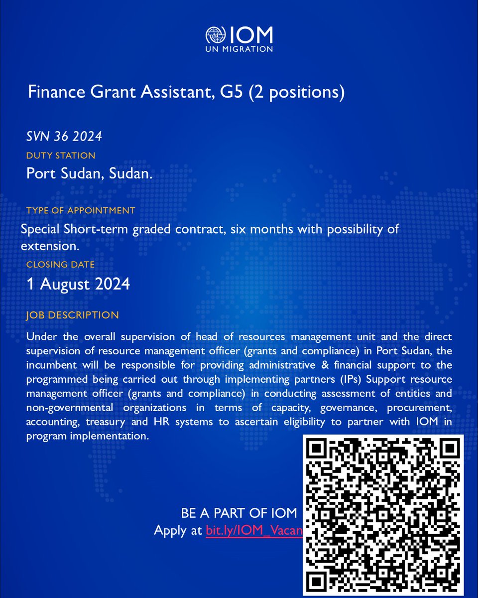 IOM is looking for a Finance Grant Assistant., G5, (2 positions) in Port Sudan, Sudan.