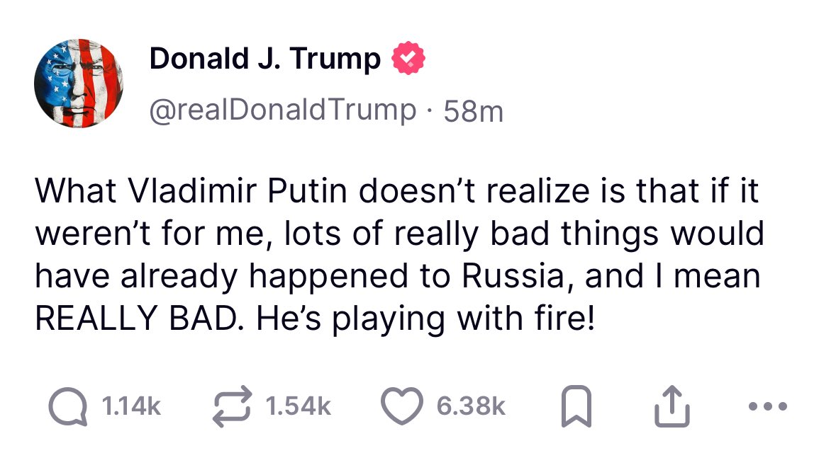 منشور آخر ل #ترامب عن بوتين يتهمه فيه ب “اللعب بالنار” قائلا” : “ما لا يعرفه هو انه من دوني لكانت أمور سيئة جدا حصلت في روسيا. اعني بذلك سيئة جدا”..”