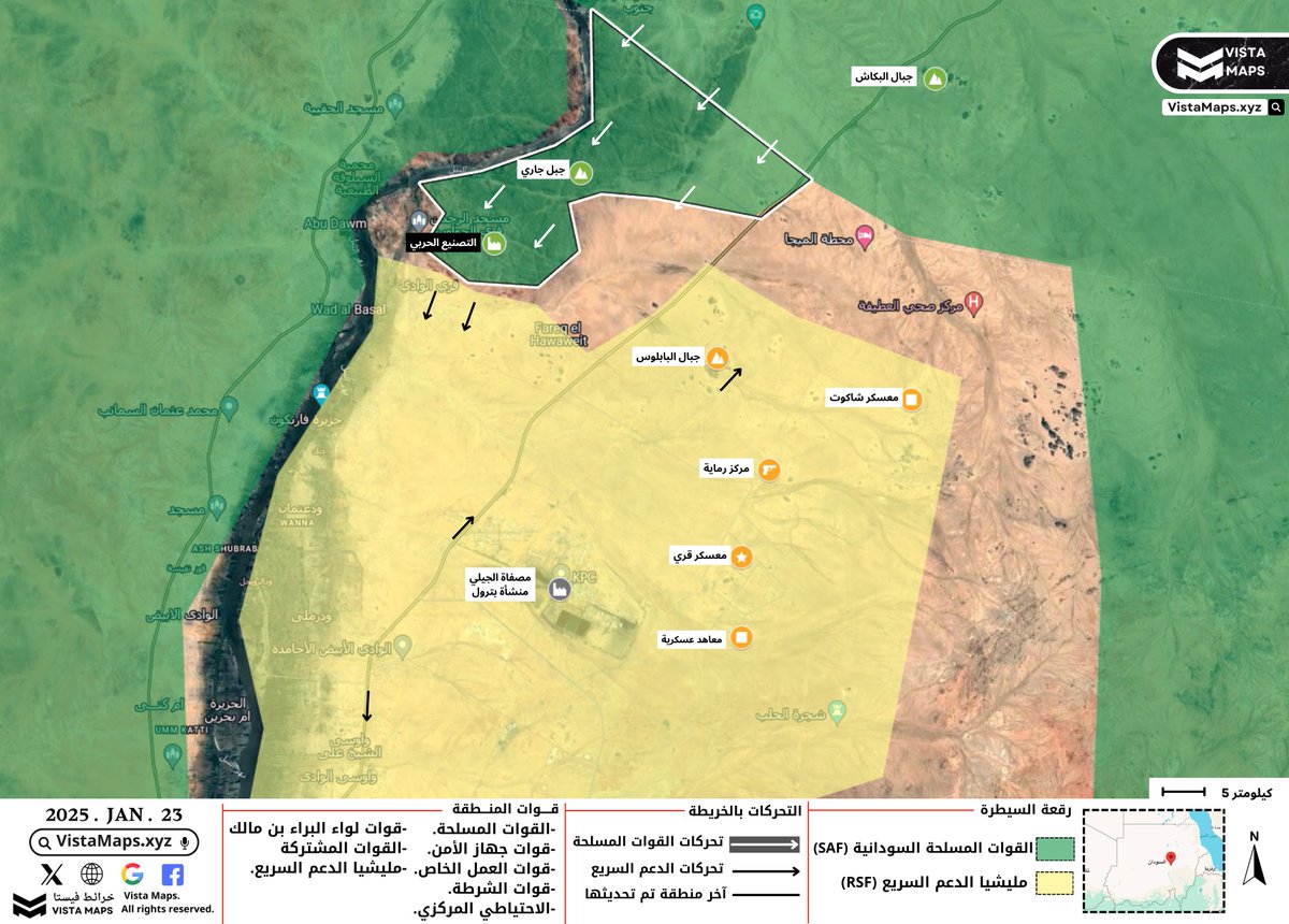 – القوات المسلحة تفرض سيطرتها على منطقة التصنيع الحربي والأنفاق بجبل جاري، عقب انهيار أبرز تحصينات مليشيا الدعم السريع في منطقة قُري.