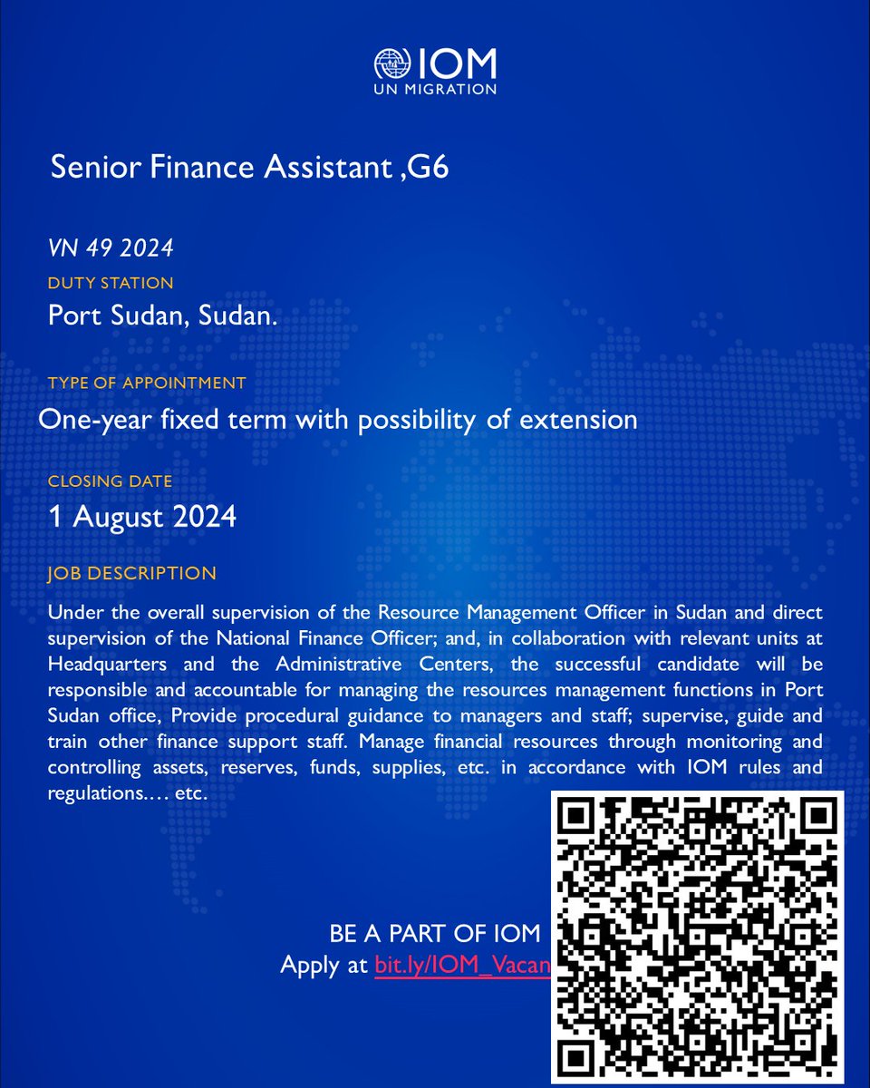 IOM is looking for a Senior Finance Assistant, G6, in Port Sudan, Sudan.