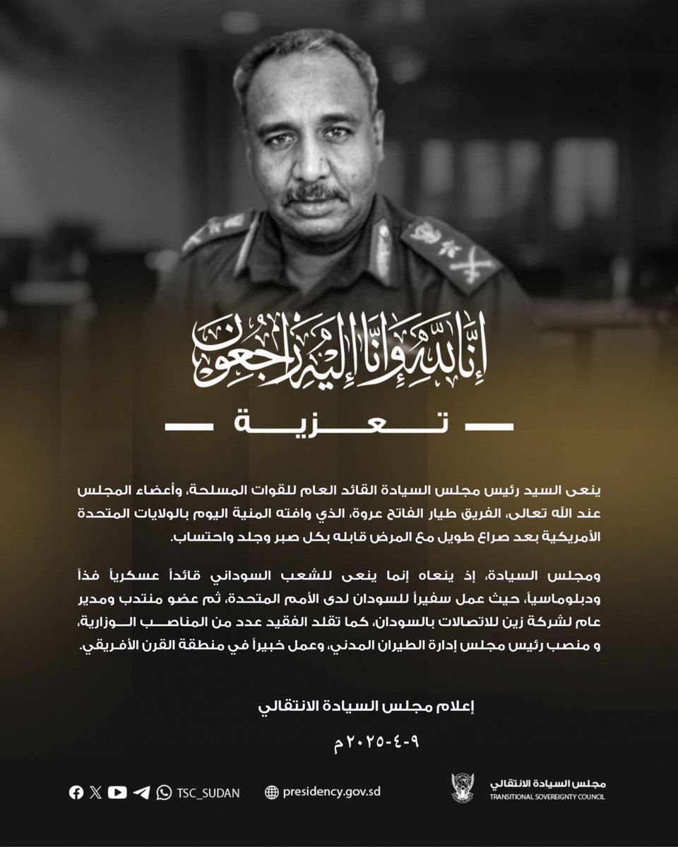 مجلس السيادة رئيس وأعضاء مجلس السيادة ينعون الفريق طيار الفاتح عروة بورتسودان ٩-٤-٢٠٢٥ … By null Published September 10, 2025 Share SHARE Facebook Twitter Pinterest LinkedIn[ad_1] ⭕️ رئيس وأعضاء مجلس السيادة ينعون الفريق طيار الفاتح عروة بورتسودان ٩-٤-٢٠٢٥ [ad_2] Source by مجلس السيادة الإنتقالي – السودان Facebook Twitter Pinterest LinkedIn Share This Article Facebook Twitter Email Print Previous Article … Next Article هجوم محمد السماني الإنصرافي على غاندي مفهوم ، في النهاية الإنصرافي يعمل مع الحرك… Leave a Comment Leave a Reply Cancel replyYour email address will not be published. Required fields are marked *Comment * Name * Email * Website Save my name, email, and website in this browser for the next time I comment. Δ SearchSearchRecent Postsأكرمنا الله صباح اليوم الأحد بلقاء إخوةٍ كرام، على ضفة النيل الأزرق، حيث شاي الش… أعلن بنك السودان المركزي في منشور إدارة السياسات رقم (2025/15) رفع الاحتكار عن ا… ندوة بعنوان: القانون الدولي والسيادة الوطنية قراءة في موقف السودان من لجنة تقصي … والي نهر النيل تستقبل وزير الموارد البشرية والرعاية الاجتماعية الوزير يشيد بالأ… كامل ادريس: رئيس اللجنة السياسية لمؤسسات الدولة السودانية. Recent CommentsNo comments to show.