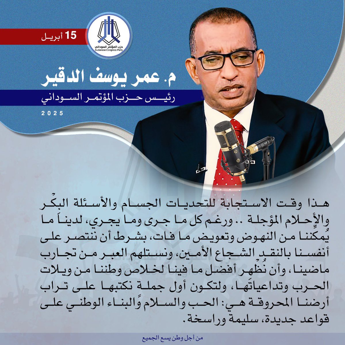 كلمة رئيس الحزب م.عمر الدقير @omereldigair بمناسبة دخول العام الثالث لحرب 15 ابريل