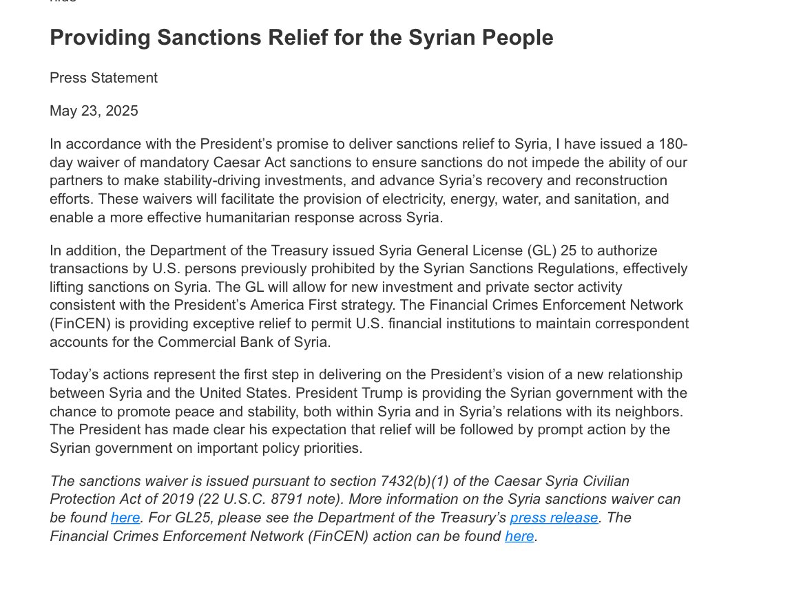 #ترمب يصدر إعفاءً لمدة 180 يومًا من عقوبات قانون قيصر تسهل توفير الكهرباء والطاقة والماء والصرف الصحي، وتمكن من استجابة إنسانية أكثر فعالية في #سوريا كما أصدرت وزارة الخزانة ترخيصا” يسمح للأشخاص الموجودين في اميركا باجراء استثمارات في القطاع الخاص في سوريا