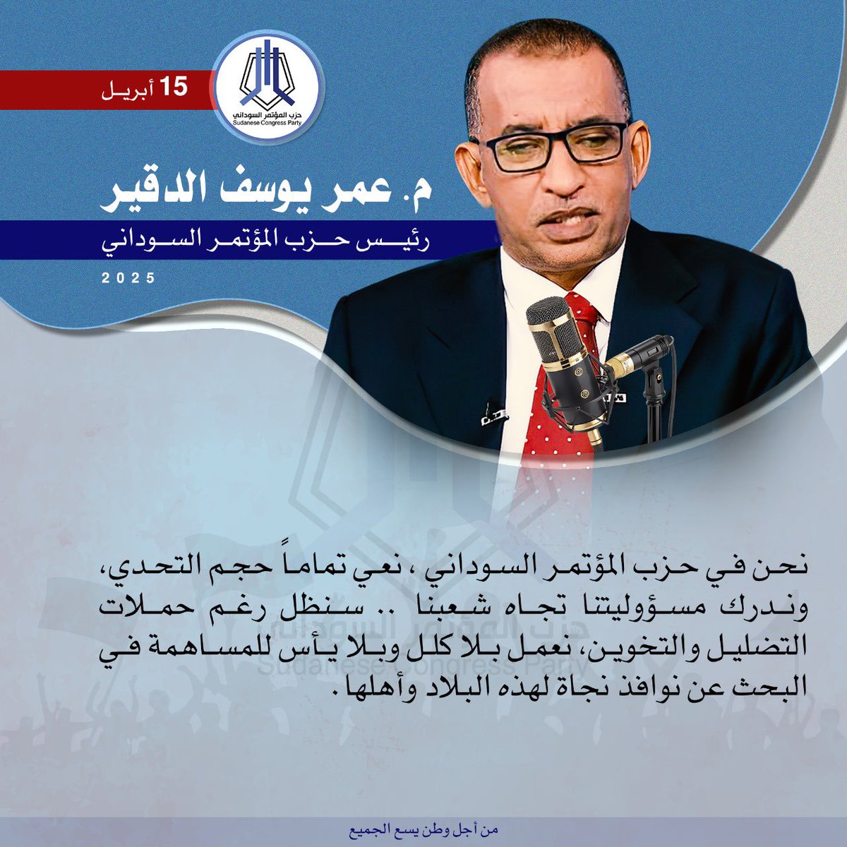 نحن في حزب المؤتمر السوداني ، نعي تماماً حجم التحدي، وندرك مسؤوليتنا تجاه شعبنا .. سنظل رغم حملات التضليل والتخوين، نعمل بلا كلل وبلا يأس للمساهمة في البحث عن نوافذ نجاة لهذه البلاد وأهلها.