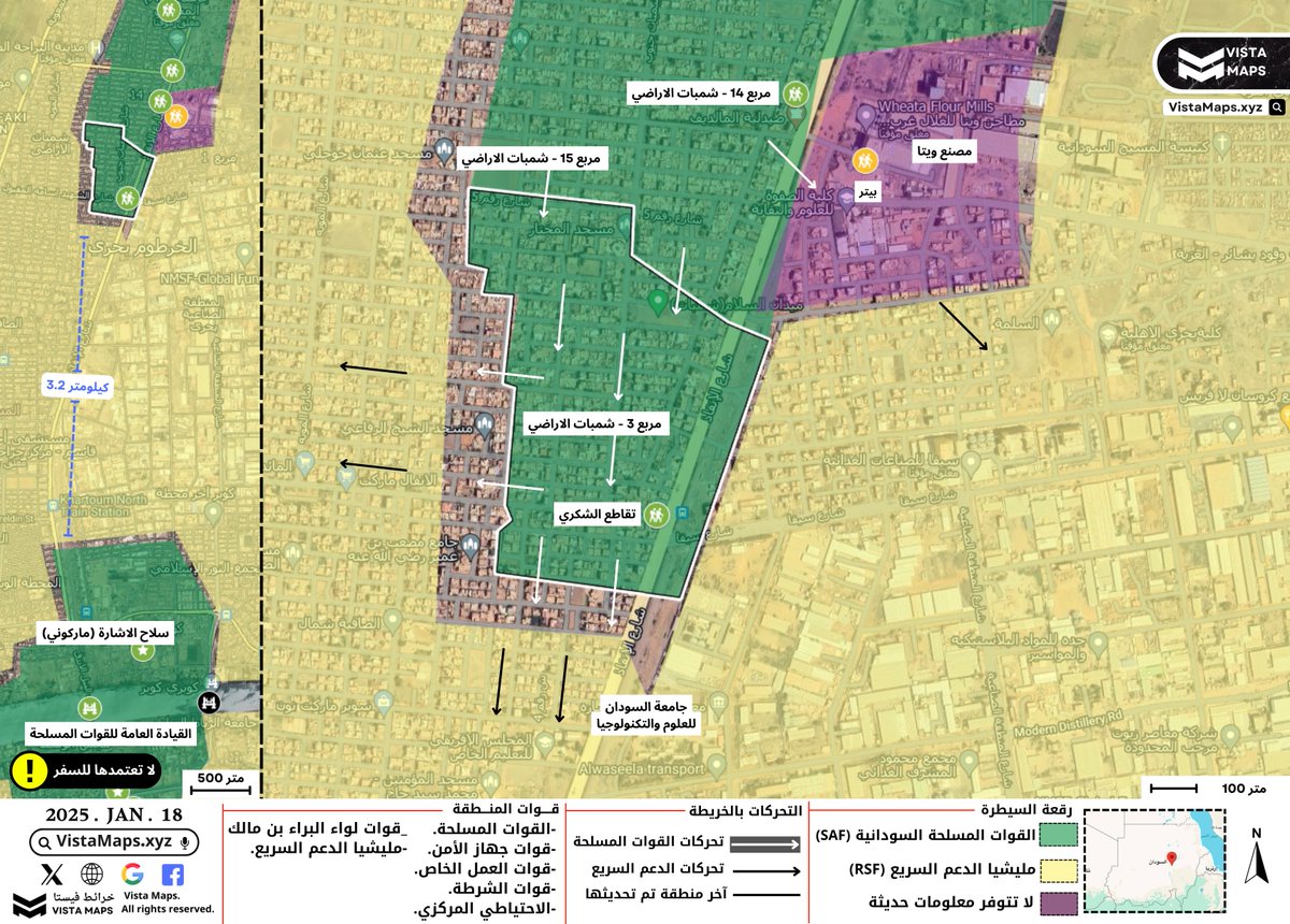 – استأنفت القوات البرية بالقوات المسلحة تقدمها في المناطق السكنية بحي شمبات الأراضي، ونجحت في فرض سيطرتها على المربع السكني (3).