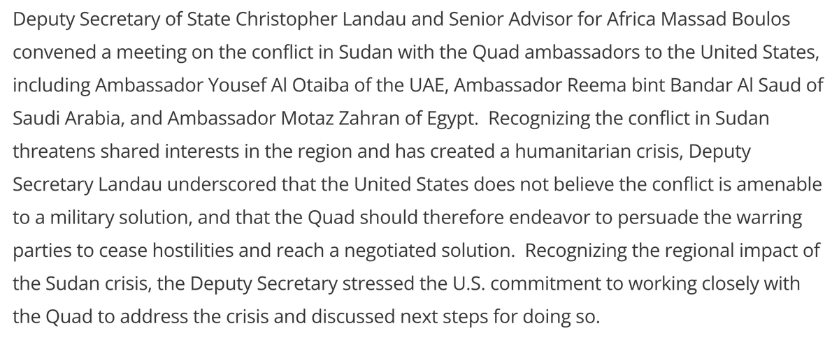 As I have been saying, the US has a unique role to play to talk to the backers of the war in Sudan, recognizing that everyone has interests at stake, and getting all to relent in their support and use their influence to pressure the parties to stop fighting. Good first step!