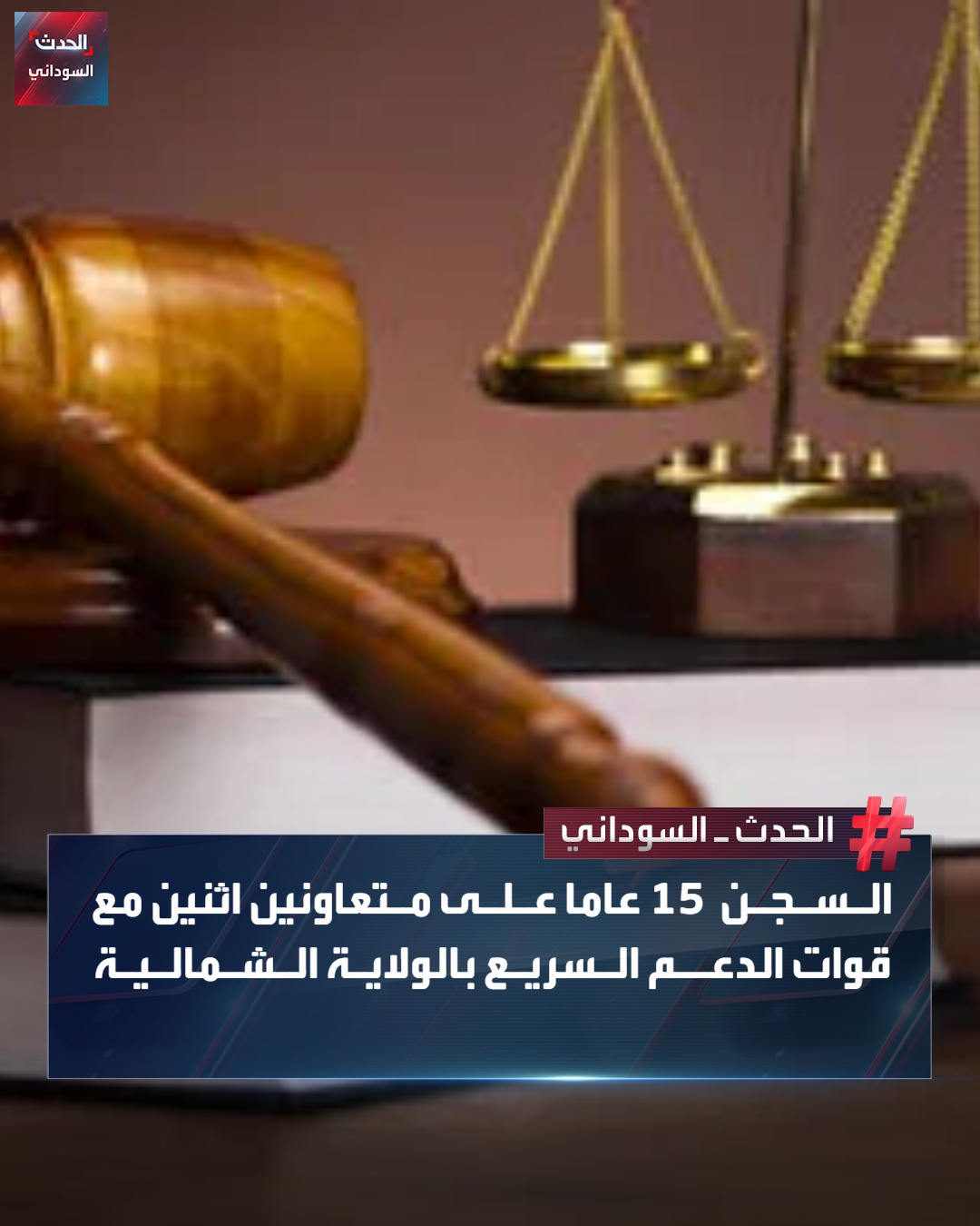 قالت النيابة العامة في السودان، إن محكمة جنايات محلية القولد العامة بالولاية الشمالية، أصدرت حكما بالسجن 15 عاما ،على متعاونين اثنين مع قوات الدعم السريع.
