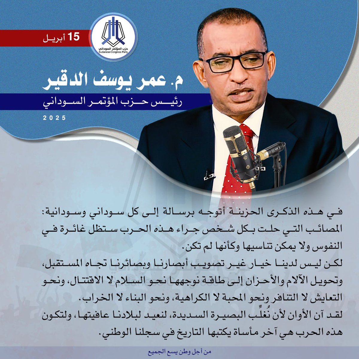 كلمة رئيس الحزب م.عمر الدقير @omereldigair بمناسبة دخول العام الثالث لحرب 15 ابريل