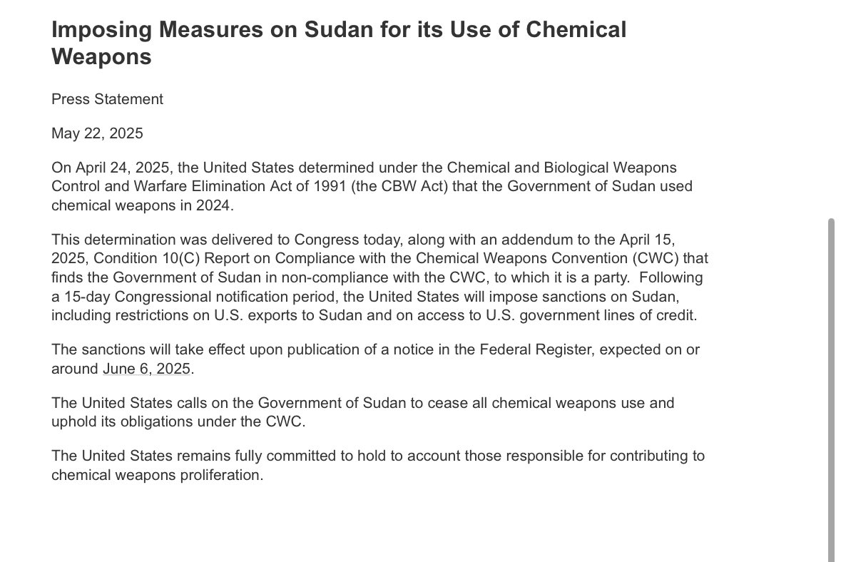 📍قبل قليل أعلنت الخارجية أنها ستفرض عقوبات على #السودان بعد ان تحققت من استعمال الحكومة للأسلحة الكيميائية في ٢٠٢٤ خلال النزاع بين الجيش وقوى الدعم السريع.