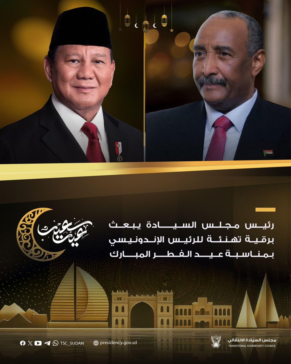 ⭕️ رئيس مجلس السيادة الانتقالي الفريق أول الركن #عبدالفتاح_البرهان يبعث برقية تهنئة لرئيس جمهورية اندونيسيا صاحب الفخامة #برابوو_سوبيانتو ، بمناسبة عيد الفطر المبارك .