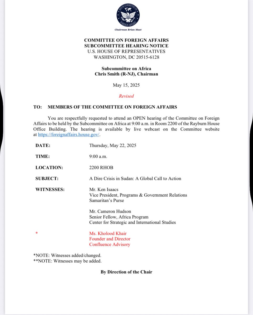 🚨 جلسة استماع في مجلس النواب الأسبوع المقبل حول الأزمة في #السودان عنوانها :”الأزمة الخطيرة في السودان: نداء عالمي للتحرك”-