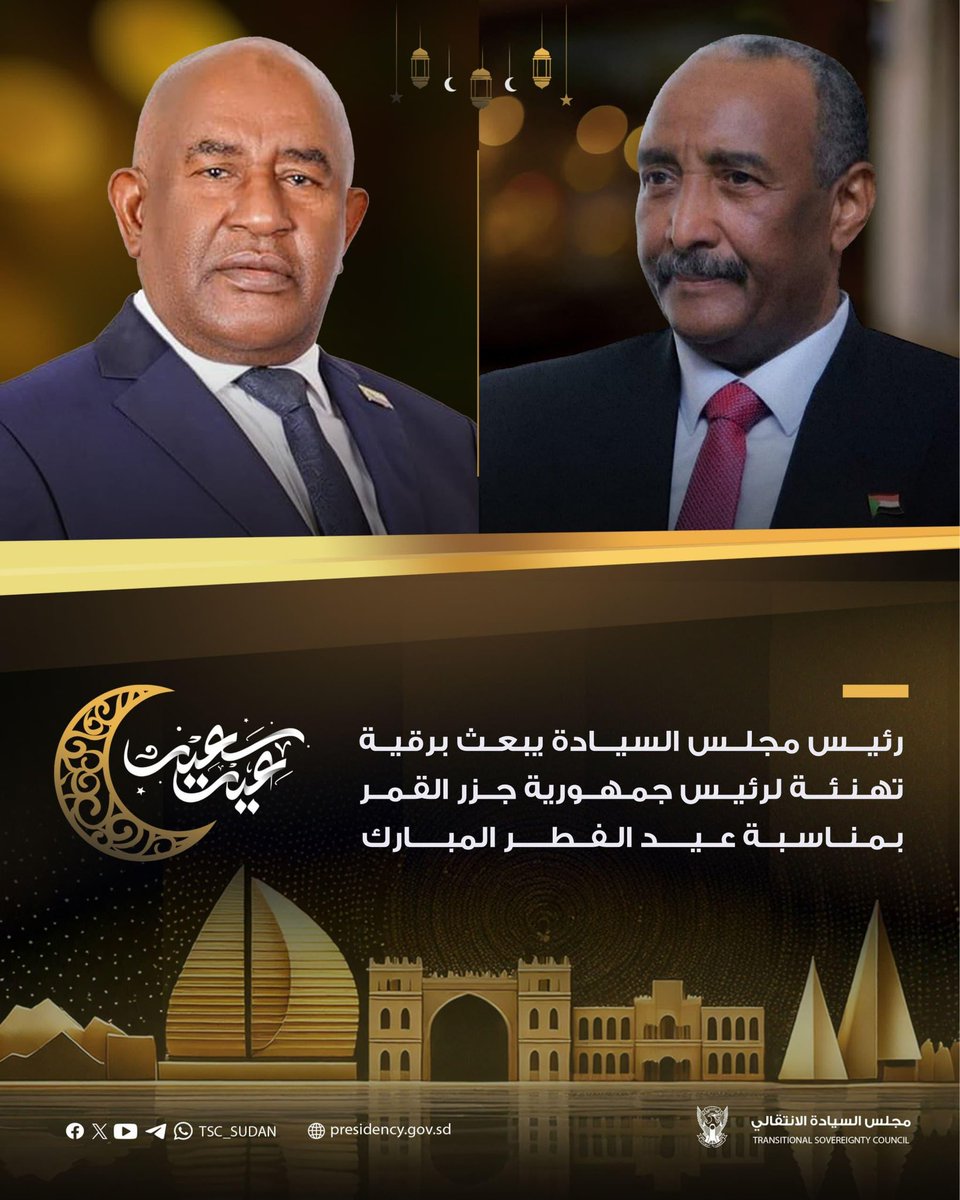 ⭕️ رئيس مجلس السيادة الانتقالي الفريق أول الركن #عبدالفتاح_البرهان يبعث برقية تهنئة لرئيس جمهورية جزر القمر المتحدة صاحب الفخامة #عثمان_غزالي ، بمناسبة عيد الفطر المبارك .