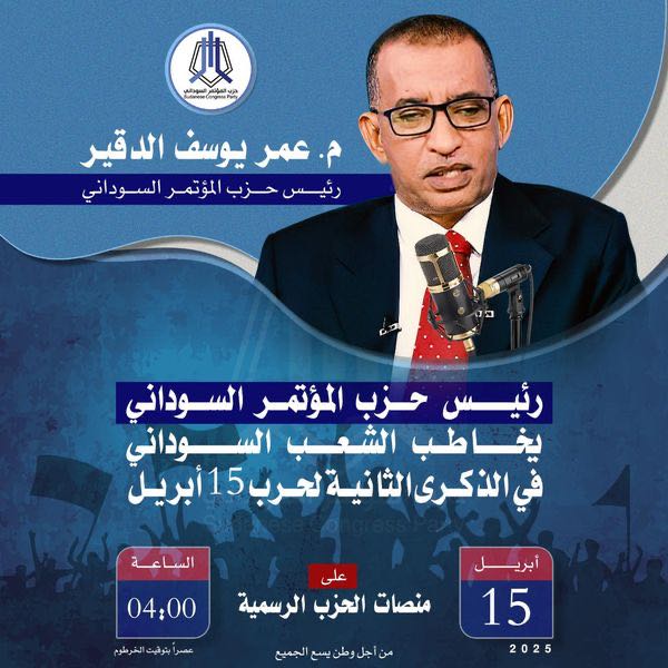يخاطب رئيس الحزب م.عمر الدقير @omereldigair الشعب السوداني بمناسبة الذكرى الثانية لحرب 15 ابريل وذلك اليوم الثلاثاء الموافق 15 ابريل 2025م في تمام الساعة الرابعة مساء بتوقيت السودان.