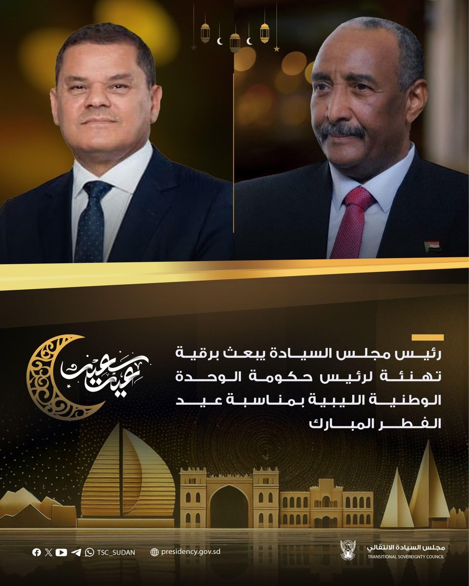 ⭕️ رئيس مجلس السيادة الانتقالي الفريق أول الركن #عبدالفتاح_البرهان يبعث برقية تهنئة لرئيس حكومة الوحدة الوطنية الليبية صاحب الفخامة #عبدالحميد_محمد_الدبيبة ، بمناسبة عيد الفطر المبارك .