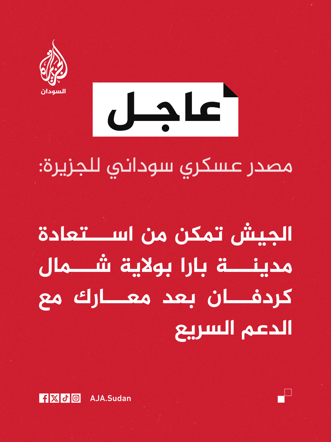 عاجل | مصدر عسكري سوداني للجزيرة: الجيش تمكن من استعادة مدينة بارا بولاية شمال ك…