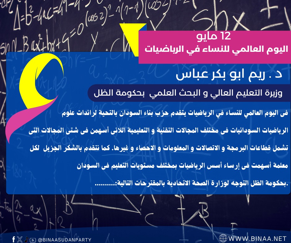 فى اليوم العالمي للنساء في الرياضيات يتقدم حزب بناء السودان بالتحية لرائدات علوم الرياضيات السودانيات فى مختلف المجالات التقنية و التعليمية اللائى أسهمن فى شتى المجالات التى تشمل