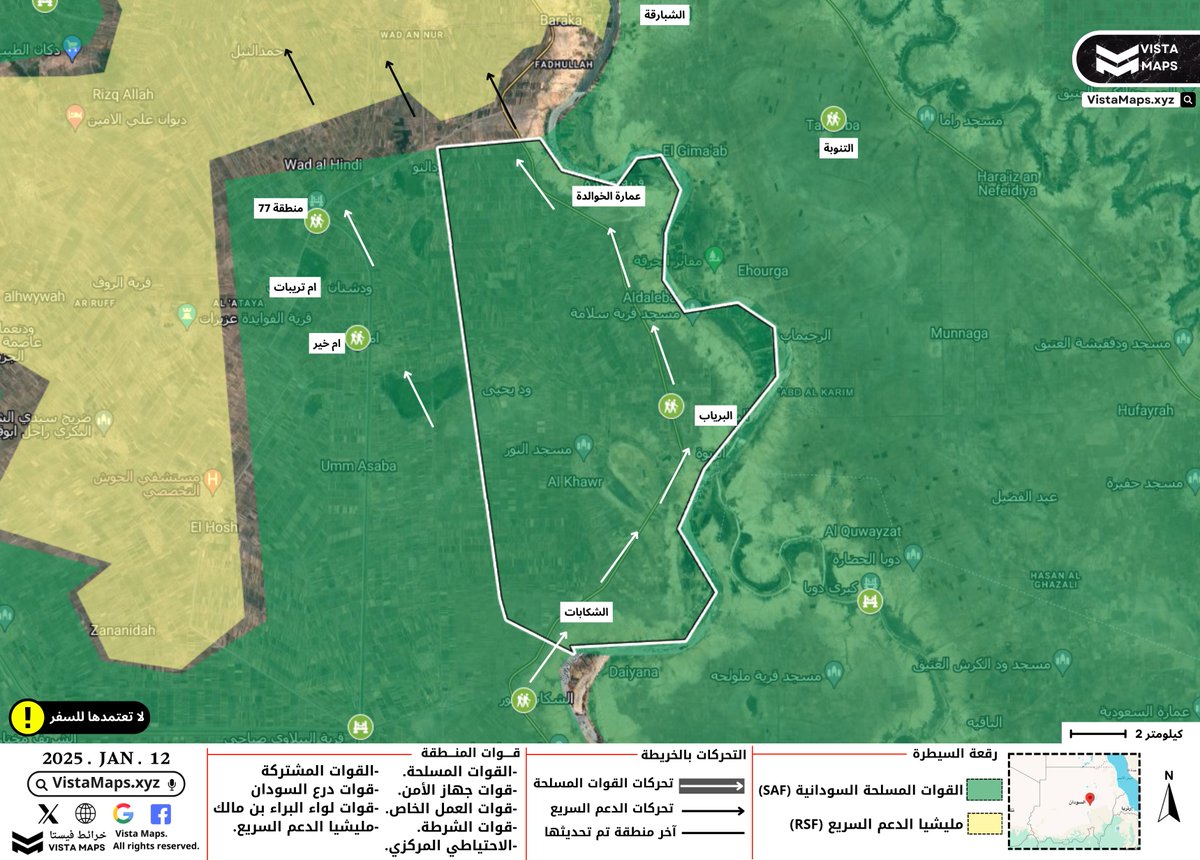 – قوات اللواء 256 بالقوات المسلحة تُسيطر على مجموعة كبيرة من المناطق منها البرياب، الشكابات، وعمارة الخوالدة، وتتجه نحو جنوب ود مدني.