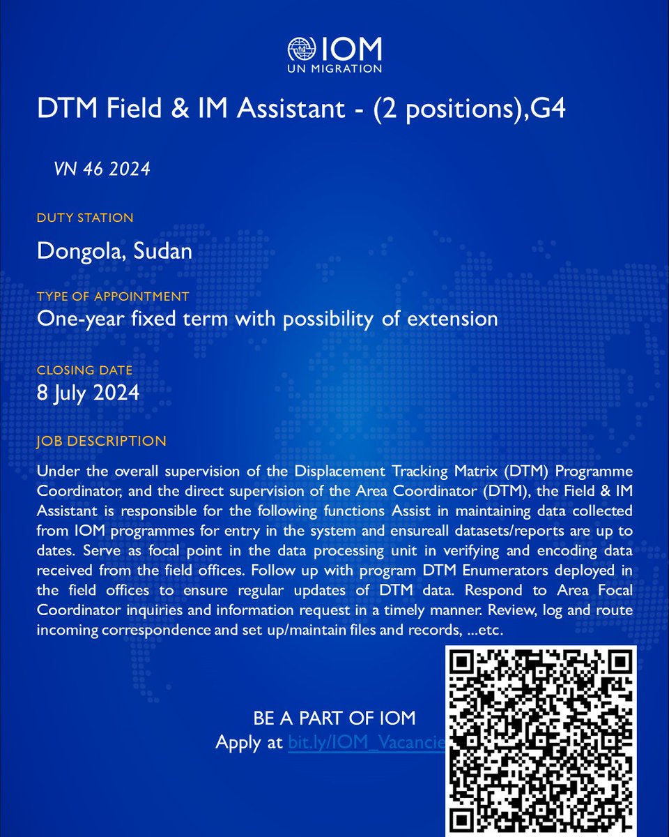 IOM is looking for a DTM Field & IM Assistant (2 positions), G4, in Dongola, Sudan.