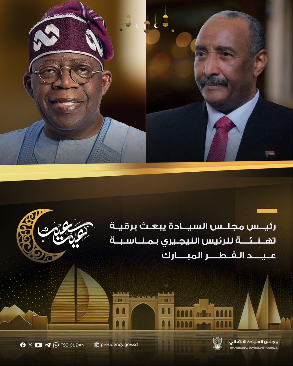 ⭕️ رئيس مجلس السيادة الانتقالي الفريق أول الركن #عبدالفتاح_البرهان يبعث برقية تهنئة لرئيس جمهورية نيجيريا الاتحادية صاحب الفخامة #بولا_أحمد_تينوبو ، بمناسبة عيد الفطر المبارك .