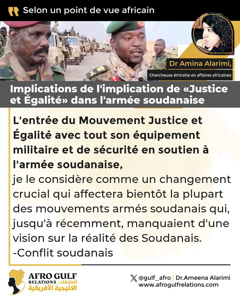 L’entrée du Mouvement Justice et Égalité avec tout son équipement militaire et de sécurité en soutien à l’armée soudanaise, je le considère comme un changement crucial qui affectera bientôt la plupart des mouvements armés soudanais qui, jusqu’à récemment, manquaient d’une vision sur la réalité des Soudanais. -Conflit soudanais