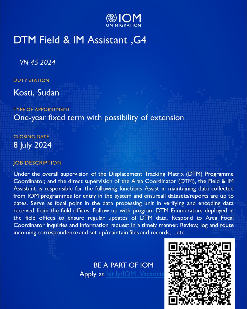 IOM is looking for a DTM Field & IM Assistant, G4, in Kosti, Sudan.