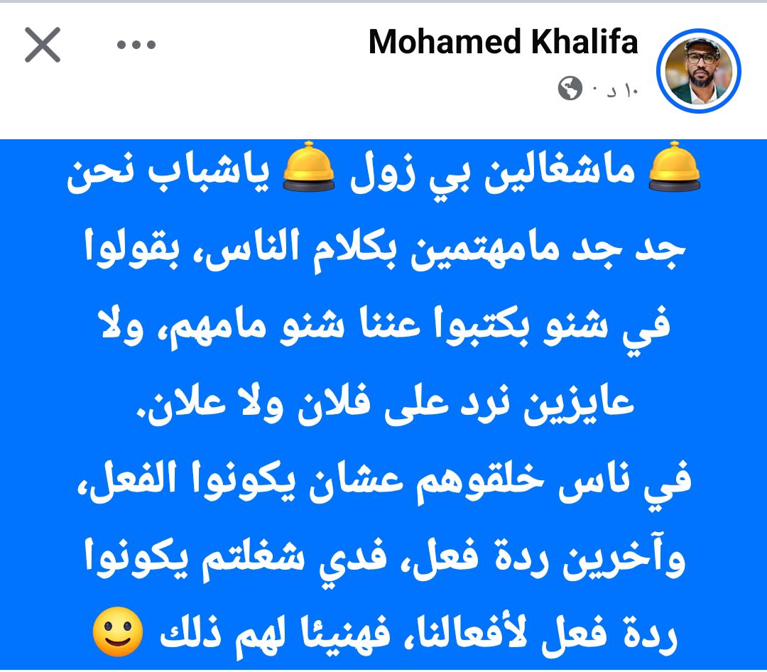 الخال دا لو الحرب انتهت خايفو يلحق شريف الفحيل ، لأنو نفس اعراض شهوة الظهور والاستحواذ على اهتمام جماهير الفيسبوك الودت شريف ورا الشمس عند الخال..