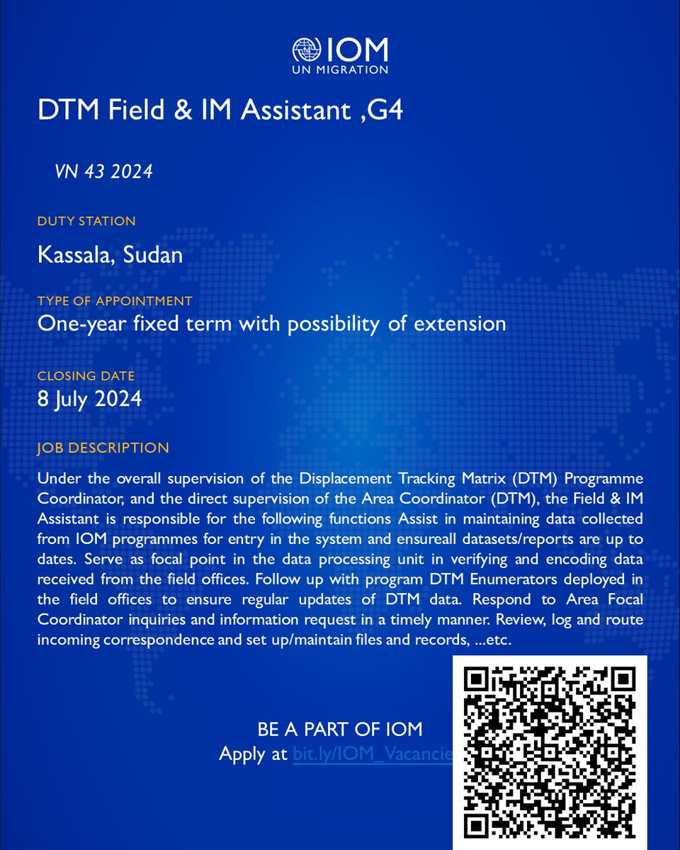 IOM is looking for a DTM Field & IM Assistant, G4, in Kassala, Sudan.