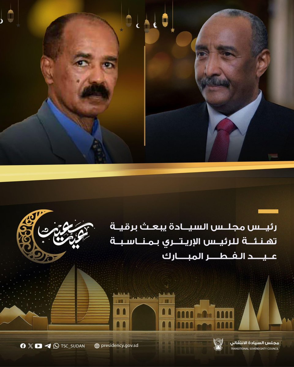 ⭕️ رئيس مجلس السيادة الانتقالي الفريق أول الركن #عبدالفتاح_البرهان يبعث برقية تهنئة لرئيس دولة أرتريا صاحب الفخامة #أسياس_أفورقي ، بمناسبة عيد الفطر المبارك .