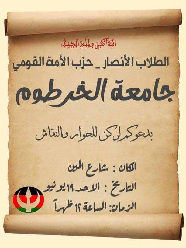 مناشط الطلاب الأنصار وحزب الامة القومي ليوم غد الأحد الموافق ١٩ يونيو ٢٠٢٢م