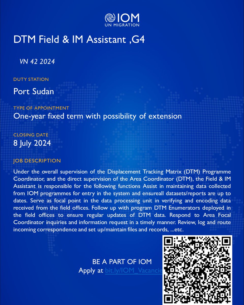 IOM is looking for a DTM Field & IM Assistant, G4, in Port Sudan, Sudan.