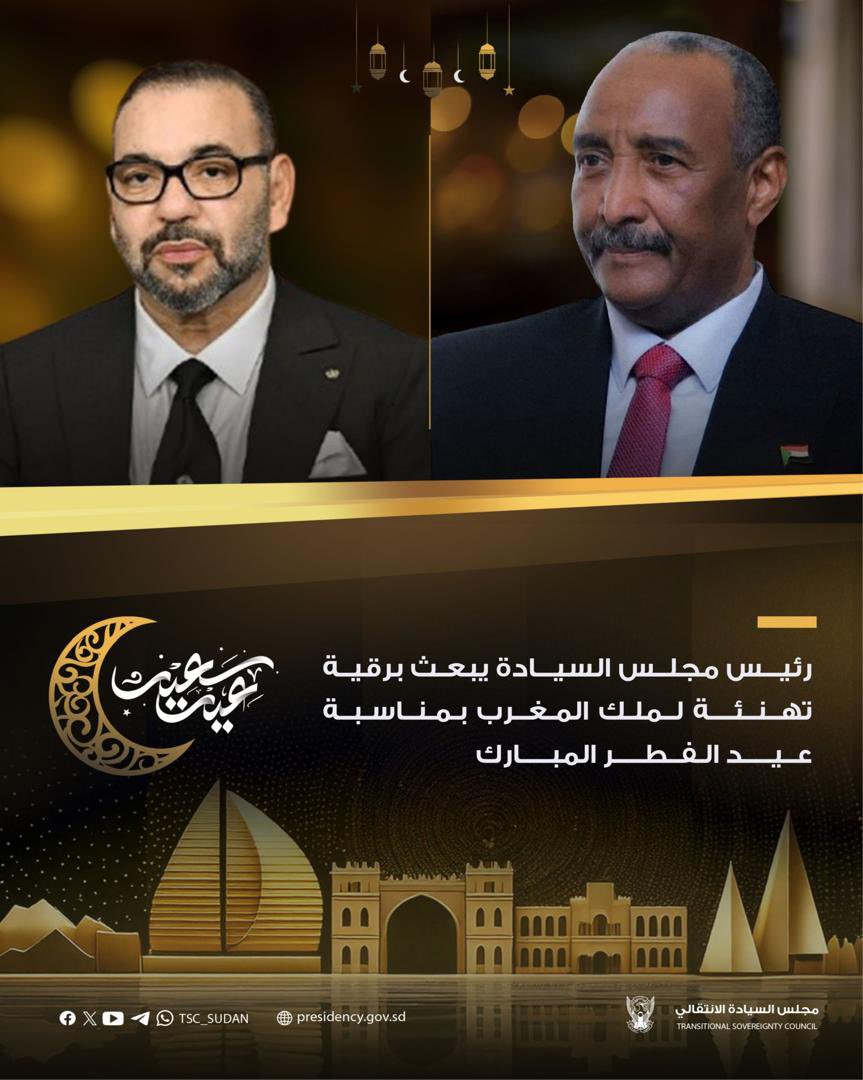 ⭕️ رئيس مجلس السيادة الانتقالي الفريق أول الركن #عبدالفتاح_البرهان  يبعث برقية تهنئة لملك المملكة المغربية صاحب الجلالة الملك #محمد_السادس ، بمناسبة عيد الفطر المبارك .