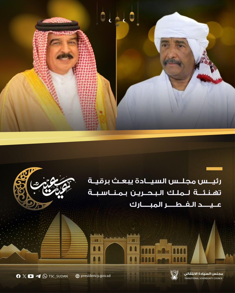 ⭕️ رئيس مجلس السيادة الانتقالي الفريق أول الركن #عبدالفتاح_البرهان يبعث برقية تهنئة لملك مملكة البحرين صاحب الجلالة الملك #حمد_بن_عيسى_آل_خليفة ، بمناسبة عيد الفطر المبارك