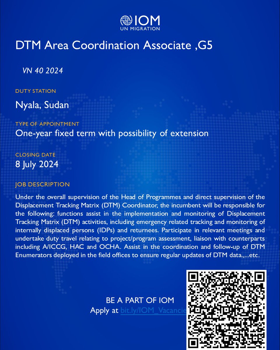 IOM is looking for a DTM Area Coordination Associate, G5, in Nyala, Sudan.