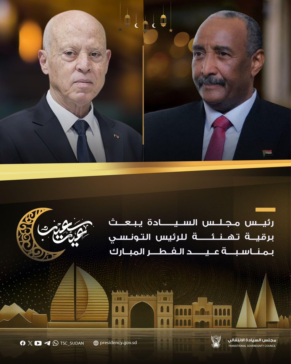 ⭕️ رئيس مجلس السيادة الانتقالي الفريق أول الركن #عبدالفتاح_البرهان يبعث برقية تهنئة لرئيس الجمهورية التونسية صاحب الفخامة #قيس_سعيد ، بمناسبة عيد الفطر المبارك .