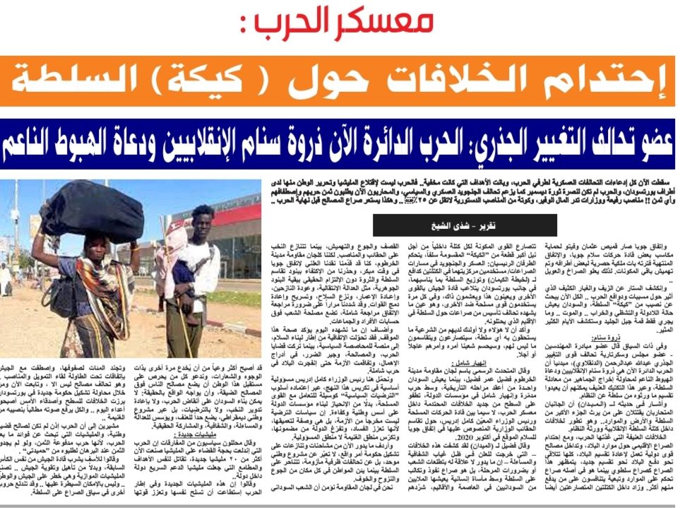 وأشار فى حديثه لـ (الميدان) أن الجانبان المتحاربان يقتتلان على من يرث الجزء الأكبر من السلطة والأرض والموارد.. وهو تطور لخلافات داخل كتلة السلطة الإنقلابية وورثة النظام.