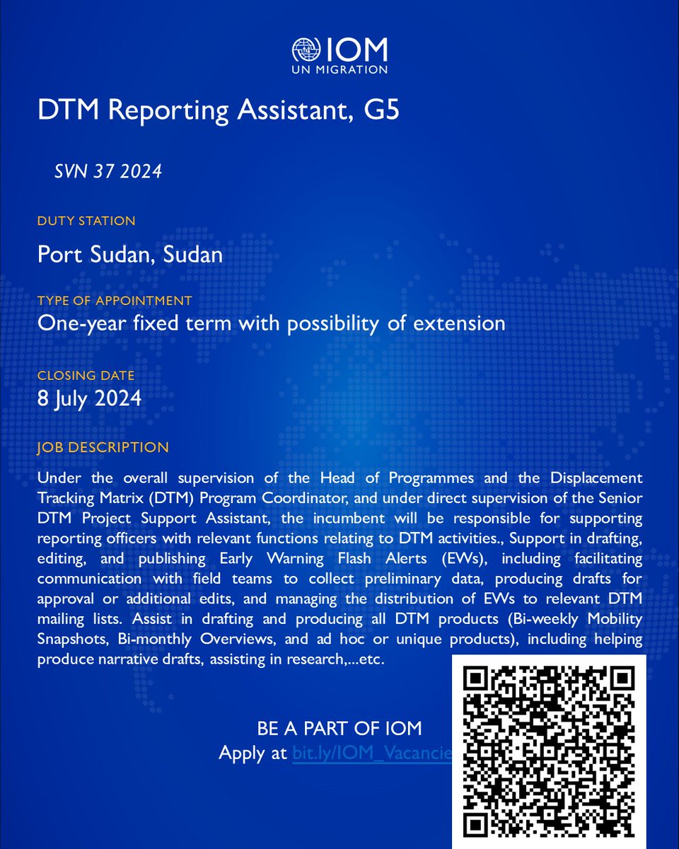 IOM is looking for a DTM Reporting Assistant, G5, in Port Sudan, Sudan.
