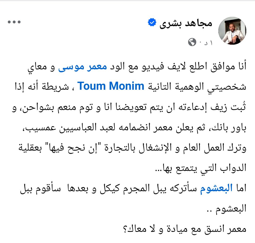 معمر موسى مجاهد بشرى أنا موافق .. بشرط الايف يجمعنا أنا وانت والبعشوم . – بخصوص التنسيق ….. By null Published September 12, 2025 Share SHARE Facebook Twitter Pinterest LinkedIn[ad_1] مجاهد بشرى أنا موافق .. بشرط الايف يجمعنا أنا وانت والبعشوم . – بخصوص التنسيق … ما فرقت انا وميادة واحد. [ad_2] Source Facebook Twitter Pinterest LinkedIn Share This Article Facebook Twitter Email Print Previous Article #سقوط_الكيزان نظام حكم البشير والمؤتمر الوطني لم يسقط في 11 إبريل 2019م ، بل سق… Next Article التحيه لكل الاهل بولاية الجزيره وكل ربوع السودان الحبيب وخصوصا محلية الكاملين قر… Leave a Comment Leave a Reply Cancel replyYour email address will not be published. Required fields are marked *Comment * Name * Email * Website Save my name, email, and website in this browser for the next time I comment. Δ SearchSearchRecent Postsأكرمنا الله صباح اليوم الأحد بلقاء إخوةٍ كرام، على ضفة النيل الأزرق، حيث شاي الش… أعلن بنك السودان المركزي في منشور إدارة السياسات رقم (2025/15) رفع الاحتكار عن ا… ندوة بعنوان: القانون الدولي والسيادة الوطنية قراءة في موقف السودان من لجنة تقصي … والي نهر النيل تستقبل وزير الموارد البشرية والرعاية الاجتماعية الوزير يشيد بالأ… كامل ادريس: رئيس اللجنة السياسية لمؤسسات الدولة السودانية. Recent CommentsNo comments to show.